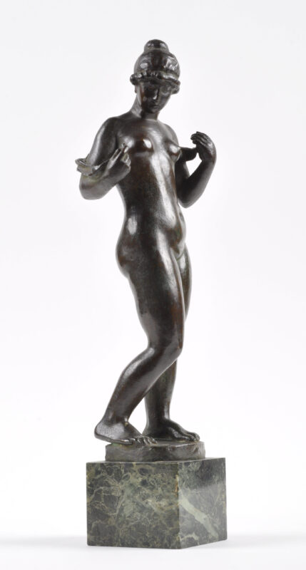 Bronze patiné portant le monogramme M dans un rond à l’arrière du pied gauche.