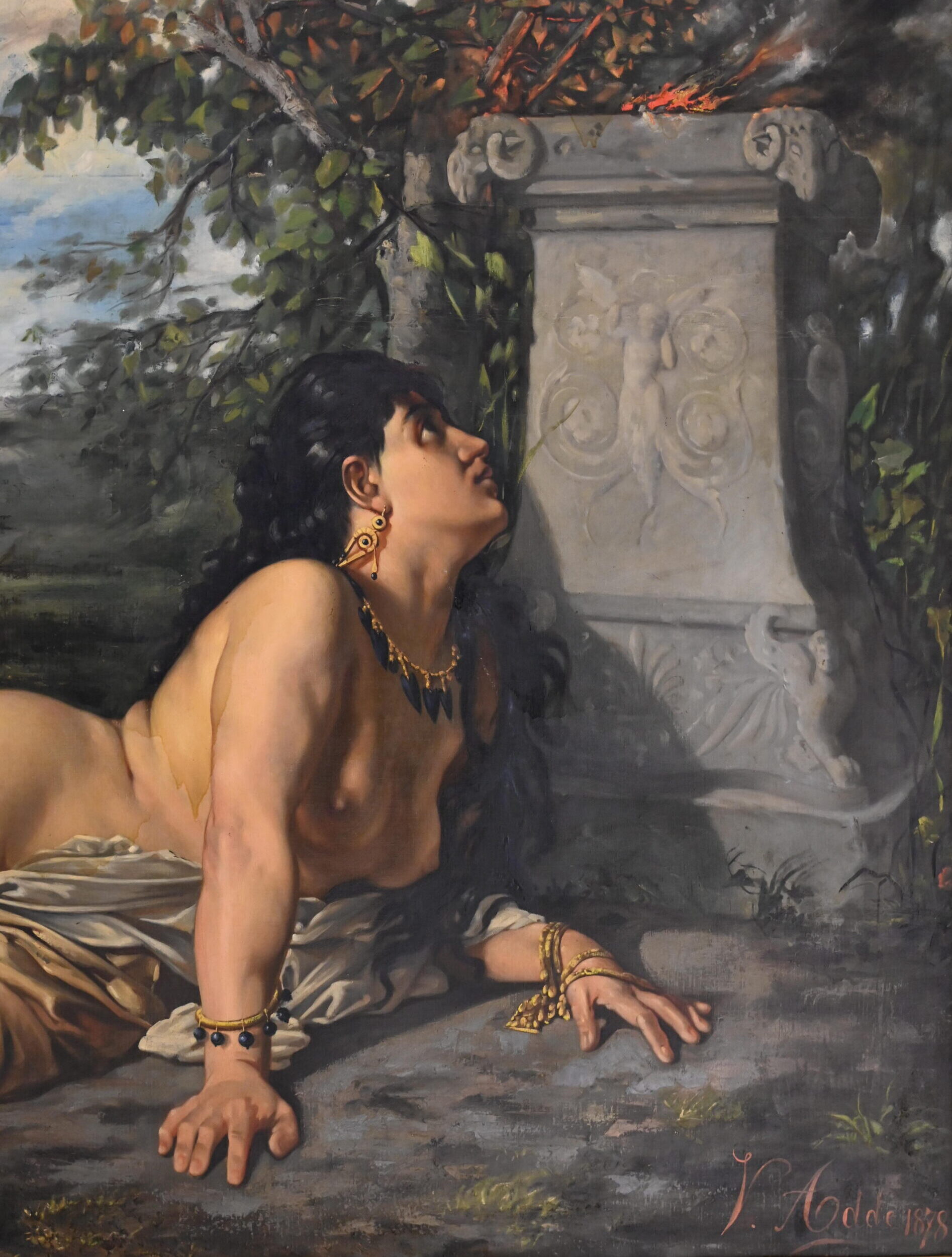 Perazzone-Brun > Ventes non adjugées > Orientale allongée devant une stèle, 1878 Victor Addé Vidal (1811-1887)Orientale allongée devant une stèle, 1878 Huile sur toile signée et datée en bas à droite Dimensions : 130,5 x 196 cm
