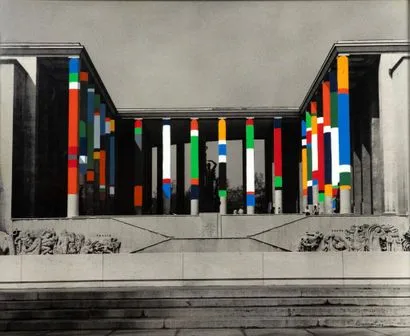 Gouache et technique mixte sur photo en noir et blanc signée et datée 1974 en bas à droite.